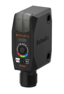 Sensor fotoeléctrico reflectivo convergente,para marcas de color, Autonics modelo BC15-LDT-C, distancia de sensado 15mm con teach-in, alimentación 12-24Vcc, NPN NA/NC seleccionable, cuenta con dos modos de detección, (Color / Color + intensidad), funciones de temporizado off delay, salida a conector M12 y demás características según hojas técnicas.