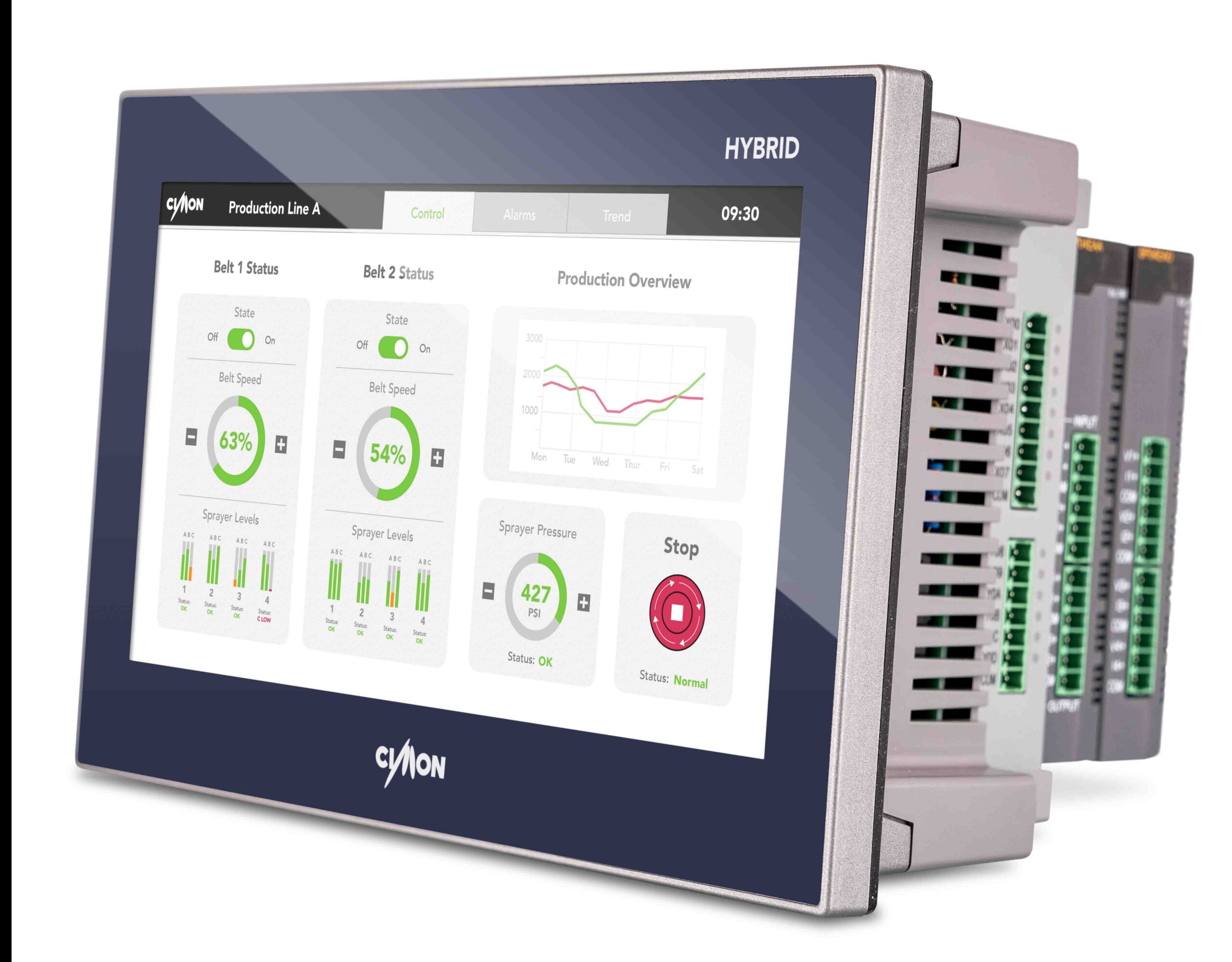 Panel de 7″ HMI + PLC serie Hybrid marca Cimon. Pantalla táctil LCD resistiva de 7″ (800x480px), comunicación RS485, 8 DI + 7 DO, slot para memoria SD, salida de audio, puerto USB, ampliable mediante módulos de expansión. Demás características en hojas técnicas adjuntas.MODELO CM-sHP07CD-DC