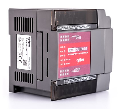 PLC compacto todo-en-uno marca CIMON modelo CM3-SB16MDTF con 8 entradas y 8 salidas digitales tipo transistor (sink). Incluye puertos RS-232, RS-422/485 y Ethernet. Soporta Modbus RTU/TCP y control PID (32 lazos con auto-tuning). Salida de pulsos de alta velocidad (2 ejes, 100 kHz). Fuente de alimentación: 2024 VDC. Capacidad de detectar automáticamente inputs Sink/source. No admite expansión.