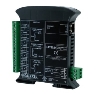 El dispositivo DAT8024 es una unidad de servidor Modbus TCP que puede manejar hasta 4 señales de salida analógicas a través de comandos digitales. 4 canales de salida aislados , salidas analógicas configurables para mA y voltios , fuente de alimentación aislada para cada canal para alimentar cargas pasivas , servidor web integrado para configurar las salidas analógicas a través del navegador , programable remotamente , conexión mediante terminales de tornillo extraíbles - LED de señalización para Link/Act Ethernet, fuente de alimentación - Aislamiento galvánico en todos los sentidos , montaje a riel DIN y demas características en hojas de datos técnica.