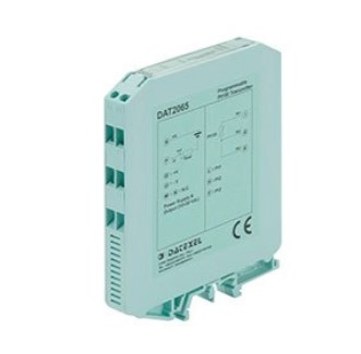Transmisor de señal Datexel modelo DAT2065, para montaje en riel DIN, entrada Pt100, 2 hilos, salida 4-20 mA, rango ajustable y demás características según hojas técnicas adjuntas