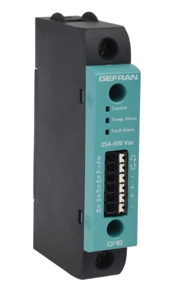 Relé de estado sólido monofásico compacto modelo GRS12048D000 de la marca Gefran, sin disipador, con disparo en cruce por cero, para cargas de hasta 480 VCA, corriente de 25A, comando de 6 … 32 Vdc, y demás especificaciones según hojas técnicas adjuntas.