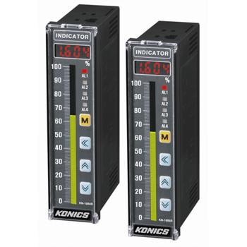 Indicador de proceso con barra indicadora de porcentaje Marca Konics, modelo KN-1000B, tamaño 36x145m con tapa de acrílico, para protección del display, múltiples entradas ejemplo termocuplas B, R, S, L, N, G, K, E, J, T, Termorresistencia PT100, en mV, V, mA, alimentación interna para sensor de 24Vdc, alimentación 85....264Vac, y demás características según hojas técnicas adjuntas: