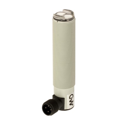 Sensor fotoeléctrico reflexión directa con focalizador MD MICRODETECTORS SpA modelo SAT-ON-0K, Ø18mm, sensibilidad ajustable, salida NPN, NA/NC seleccionable, conexión ficha M12 a 90º (No incluye el focalizador) y demás características según hojas técnicas adjuntas