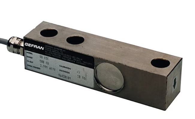 Celda de carga GEFRAN modelo SB-K5C-FP 2130X000X30, rango de medida 0-500 kg. Agujero de aplicación de carga, con 3 metros de cable.
