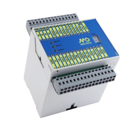 Centralita de seguridad multirrayo (categoría 2), Marca Md Microdetectors Mod. SBCR03/S-AM, para protección de zonas peligrosas contra accidentes, unidad preparada para la conexión de sensores ópticos SH / TH ó SBA / SBH, montaje a riel DIN, dos salidas PNP, Alimentación 24 VCC, con función muting y override, y demás detalles según hojas técnicas adjuntas;