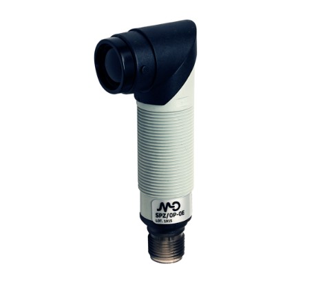 Sensor infrarrojo receptor marca MD MICRODETECTORS Mod. SPZ-0P-0E, Cilíndrico-Plástico-18mm-Optica 90º-NPN-NA/NC-14mts-10/30VCC-Conector M12