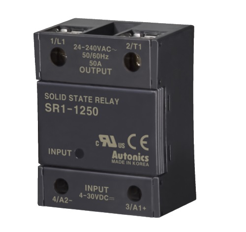 Relé de estado sólido monofásico de Autonics (modelo SR1-4250), una solución funcional. Tensión de carga de 24-240 VCA, capacidad de 50 Amperes. Tensión de control de 90-240 VCA y dispara en paso por cero.