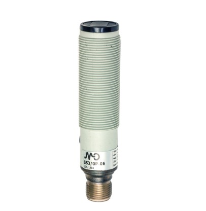 Sensor fotoeléctrico de reflexión difusa MD MICRODETECTORS SpA modelo SS3-0P-0A, de cuerpo cilíndrico plástico roscado M18, alcance 10 cm, sensibilidad regulable, salida PNP NA/NC seleccionable, alimentación 10-30 Vcc y demás características según hojas técnicas adjuntas