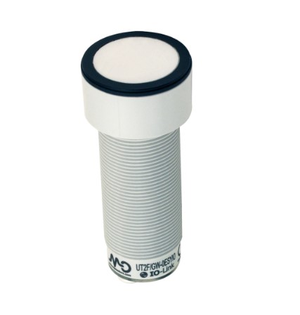 Sensor ultrasónico marca MD MICRODETECTORS mod. UT2F/E90E, cuerpo diámetro 30 mm, distancia de sensado 350-6000 mm, salida NPN – NO/NC + salida analógica de 0…..10 V, sensibilidad ajustable, alimentación 15-30 Vcc, IP67, con conexión mediante ficha M12 y demás características según hoja técnica adjunta.