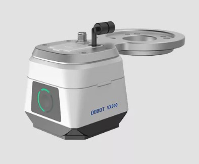 Cámara inteligente industrial Dobot VX500. Herramientas de visión: calibración 2D y 2.5D, posicionamiento 2D y 2.5D, medición de anchos y diámetros, reconocimiento de códigos, caracteres, plantillas y puntos, etc. Sensor CMOS con obturador global. Resolución: 2368 x 1760 píxeles. Formato de imagen: Mono 8. Tamaño de píxel: 3.2 µm. Tamaño de sensor: 1/1.7. Velocidad máxima: 30 fps. Interfaz de lente M12 con enfoque mecánico. Longitud focal: 12.4 mm. Iluminación integrada. Protección IP54. Peso: 520 g. Temperatura de operación: 0 a 50°C. Alimentación: 24 VDC, consumo máximo 48 W. Conectividad: Ethernet (para debugging) + conector M8 de 8 pines con I/O digitales y analógicos (DI x2, DO x2 PNP, AI x2 compartido con RS485). Campo visual desde 37.9 x 28.1 mm (a 60 mm) hasta 1894.4 x 1408 mm (a 3 m).